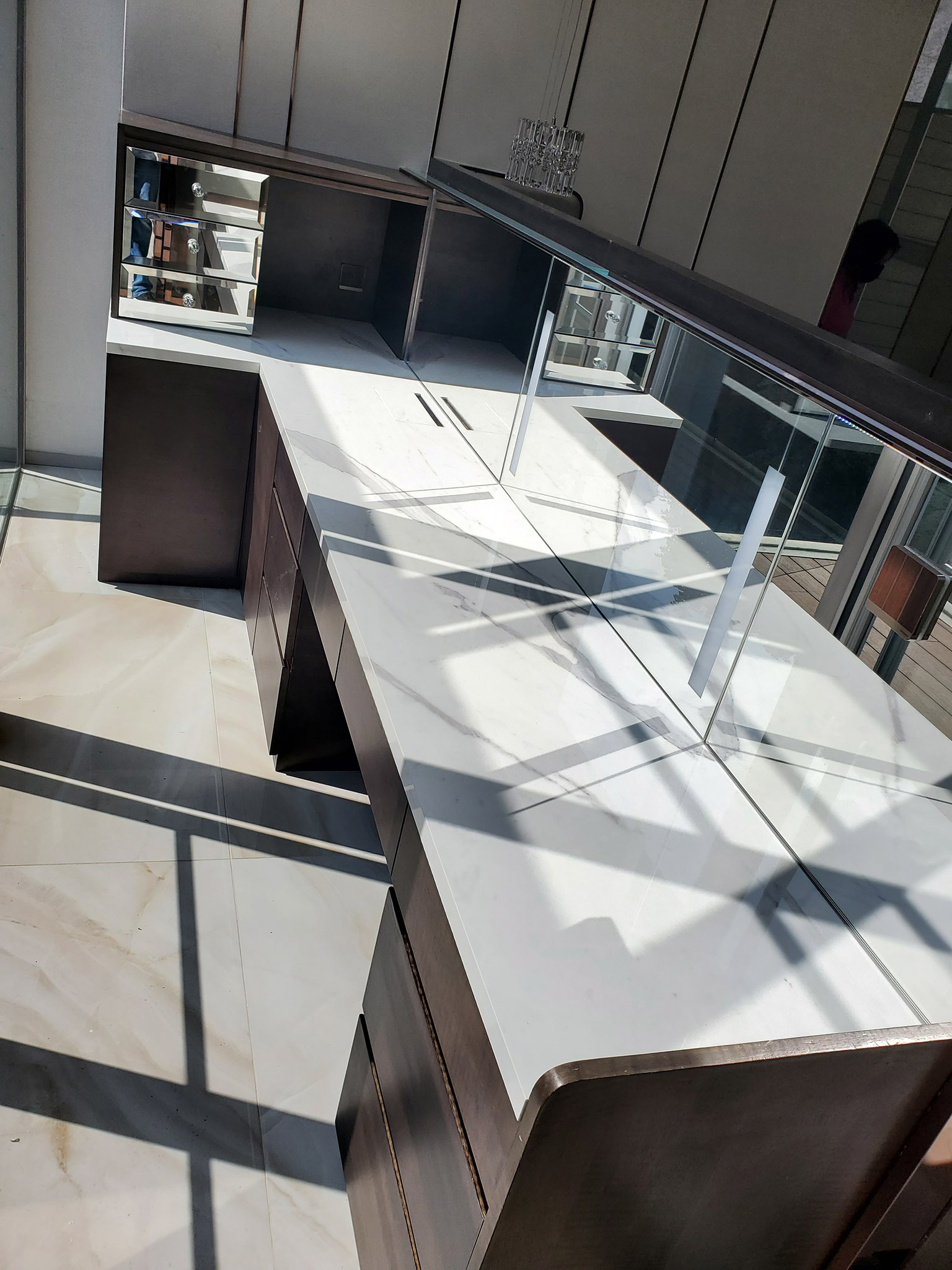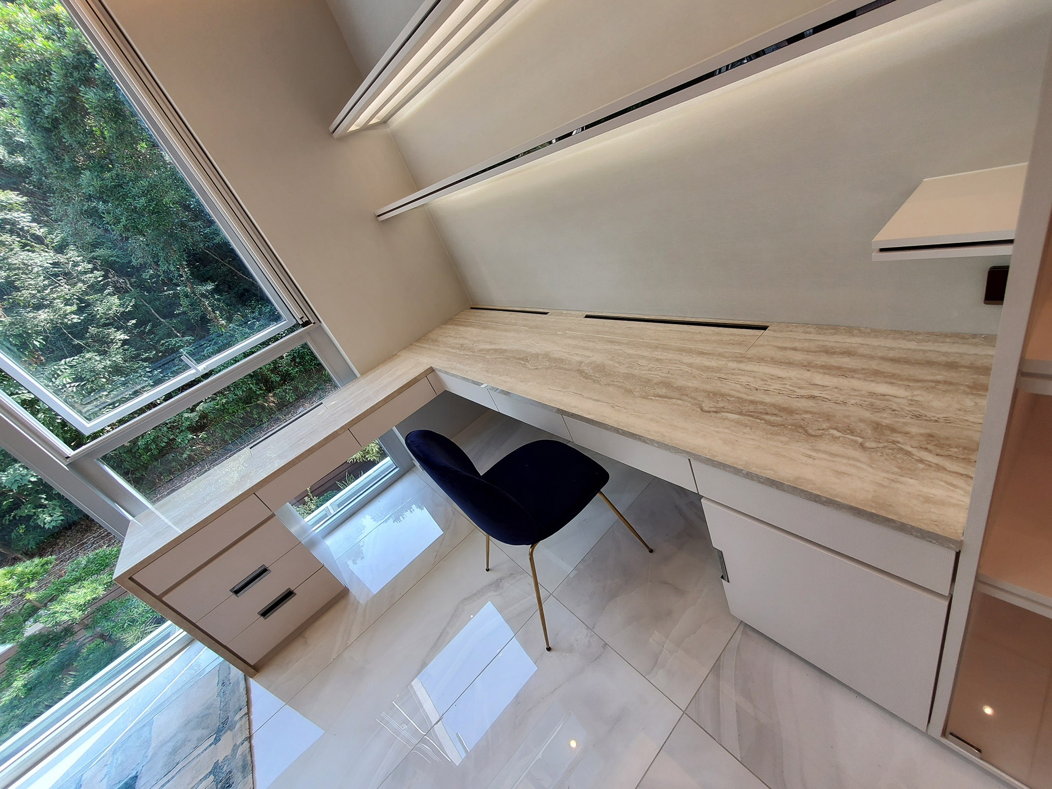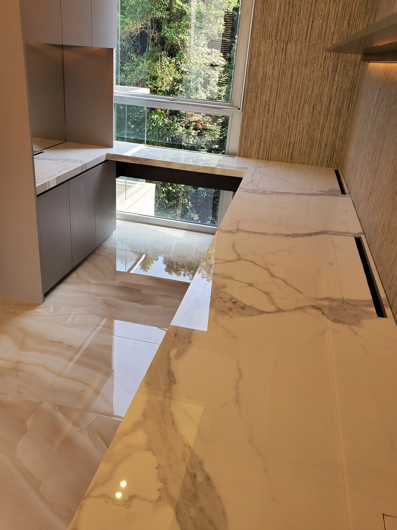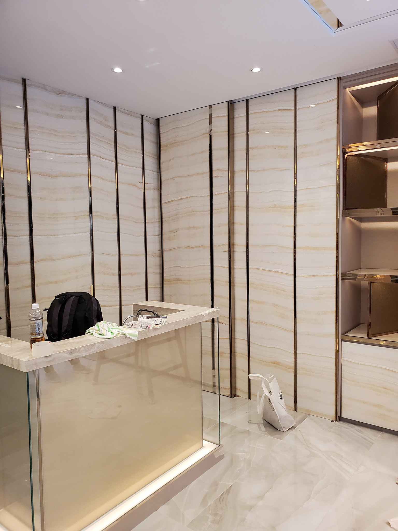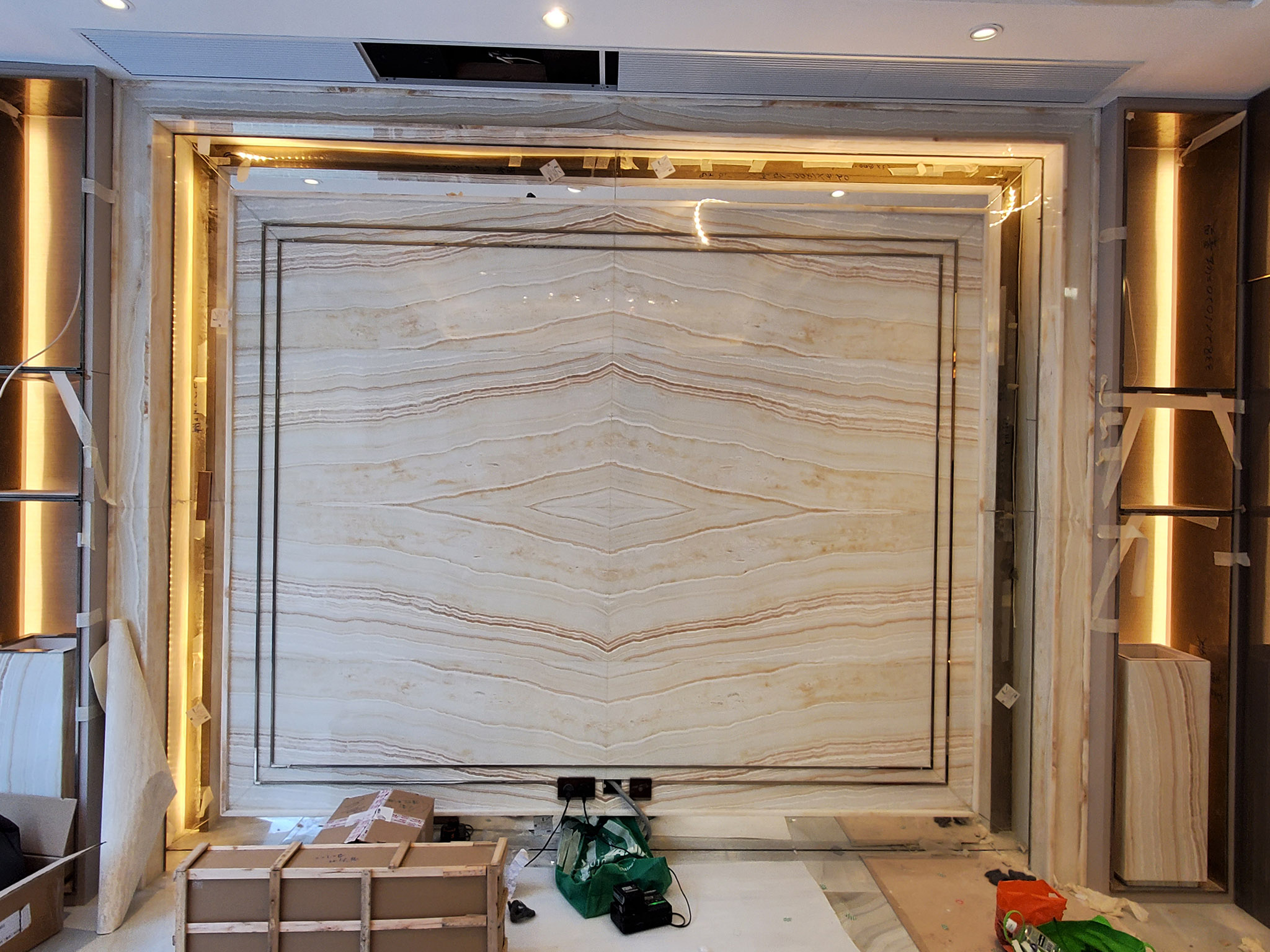 Used thin stone panel(LFM-SA-1054 Icy white onyx) as feature wall
